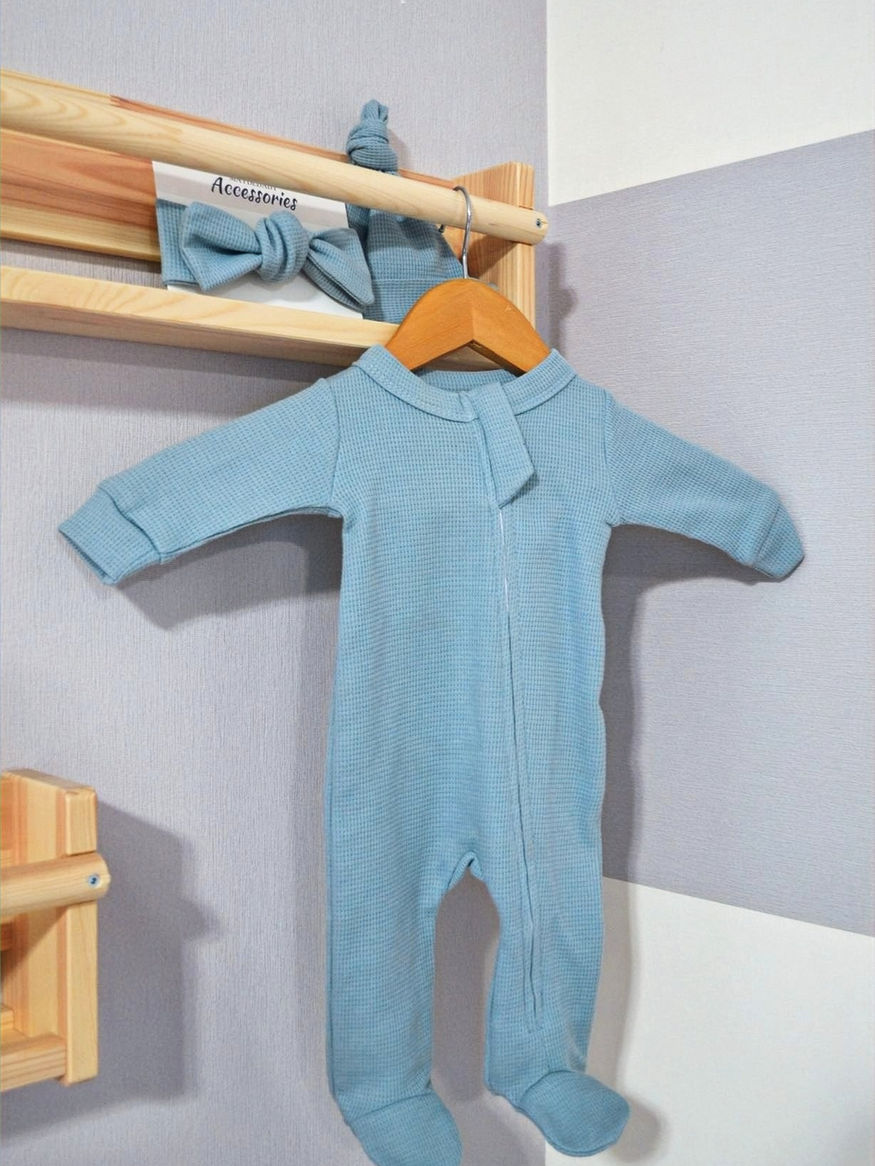 Колір блакитний — глибокого насиченого відтінку. Ми вважаємо його уніерсальним, тому можна обрати як комплект з шапочкою для хлопчика, так і образ з повʼязкою або бантиком на резинці для дівчаток.